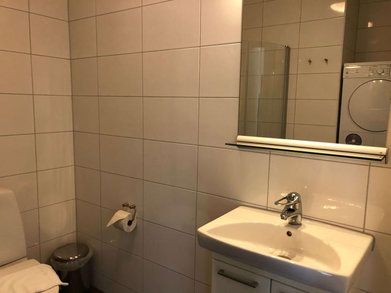 The bathroom is fresh and offers a WC, a shower, washing machine, and dryer.