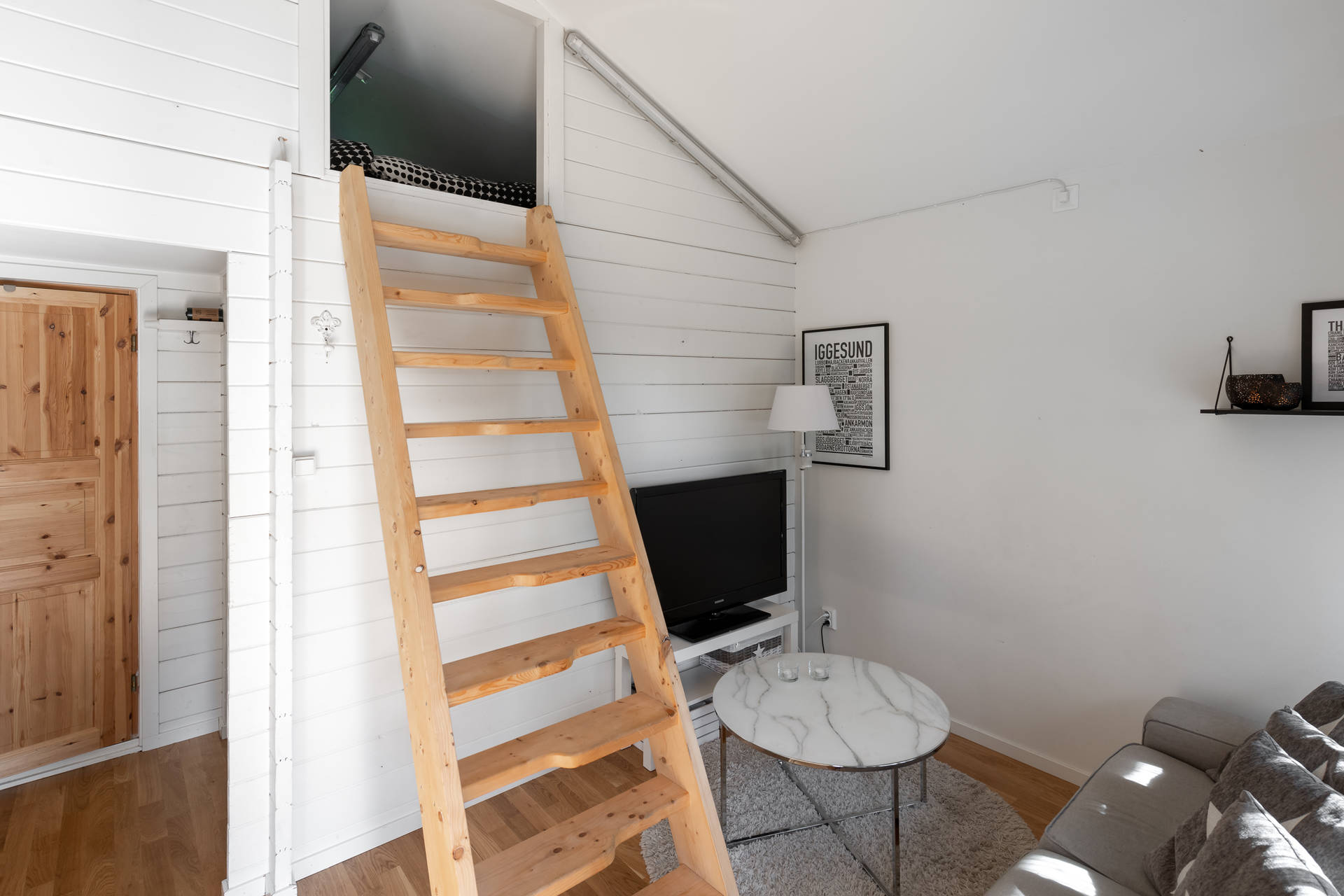 The house has a living room, a sleeping loft for two, a full kitchen (including laundry machine), bathroom with shower and also a outdoor area and a garden of your own.