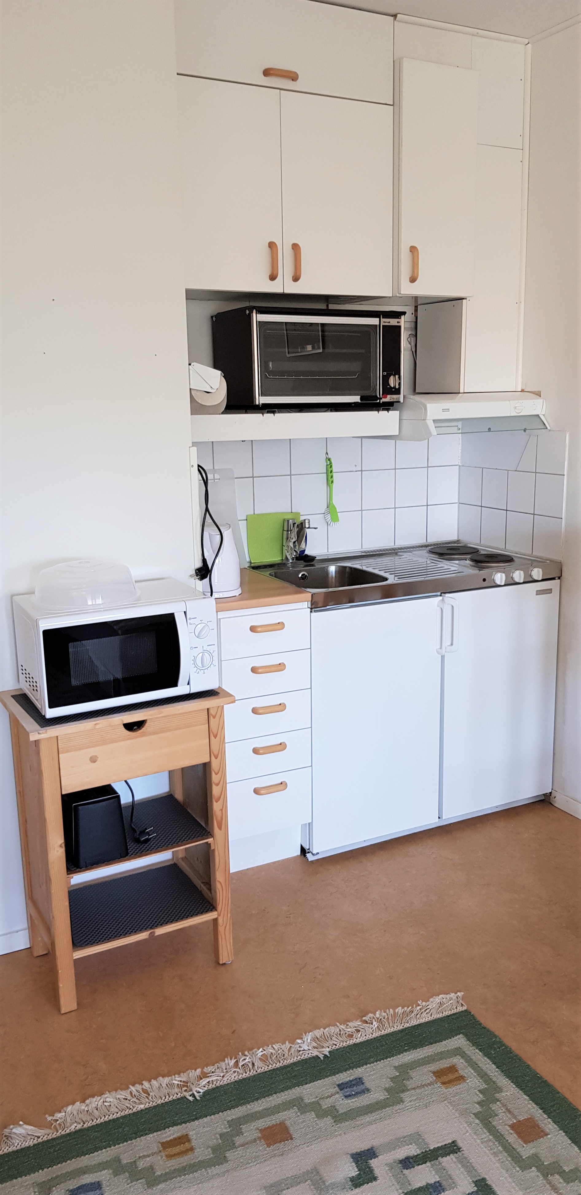 The apartment is about 24 sqm and consists of a room with a kitchenette, fully equipped with fridge, microwave, stove and oven. In addition to this, the room contains a dining table, worktable, TV furniture and bed Bathroom with shower, chest of drawers and WC. Balcony that’s facing west. Laundry room is available in the house.