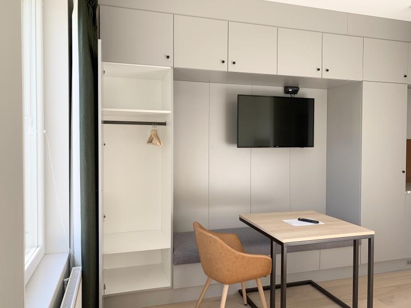 The apartment consists of a hall, built-in wardrobes and closets for personal belonging storage, spacious bathroom with towels provided, a well-equipped kitchen with appliances (stove, fridge, freezer, fan, coffee machine, and kettle), culinary utensils for cooking, open living room with dining area, sleeping area with king-size bed. This apartment is fully furnished and serviced including all kitchen utensils, bedsheets, and towels, cleaning once per week with a change of bed linen and towels. The rent includes gym access, electricity, internet, water, heating, and cable tv.