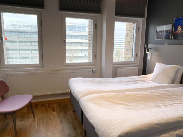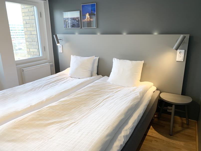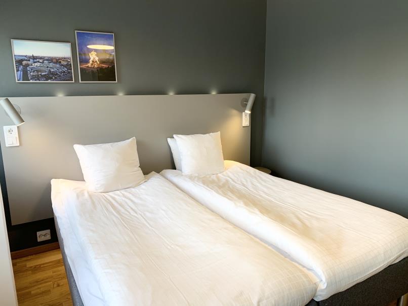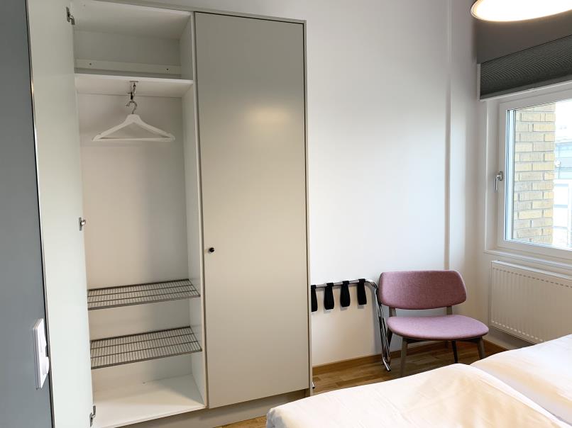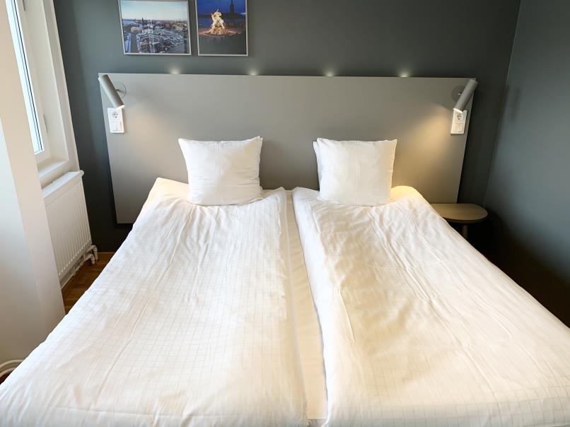 King-size bed with clean bedsheets, sideboard, armchair, wardrobe and reading lights. Windows are soundproof and with darkening curtains. Possible to have either king-size bed or two single beds (90cm).