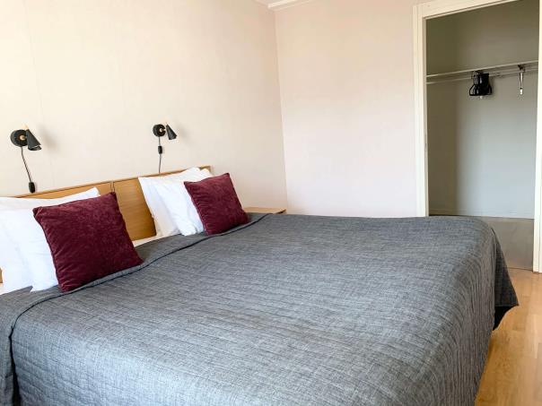 The bedroom is spacious and is accessible from both sides of the living room. There are two single beds, clean sheets and linens as well as storage space, and two bed tables.