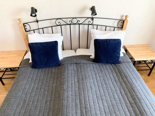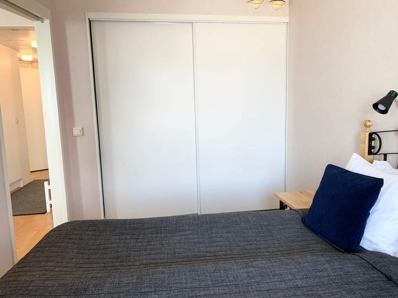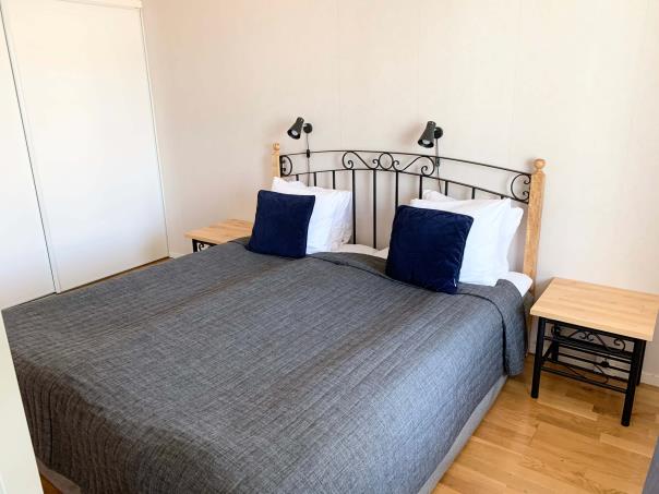 The bedroom is spacious and is accessible from both sides of the living room. There are two single beds, clean sheets and linens as well as storage space, and two bed tables.