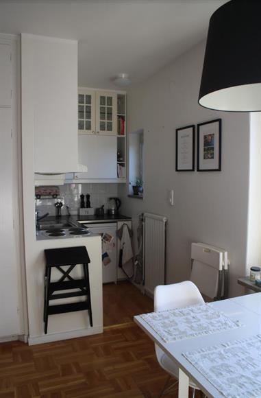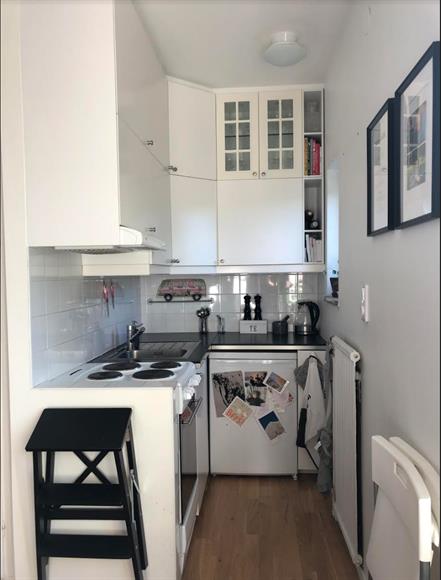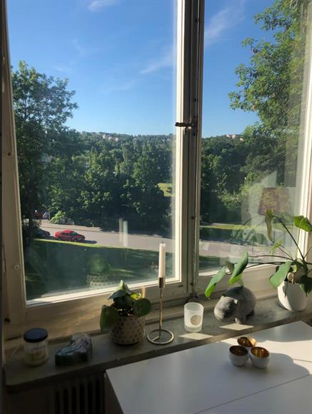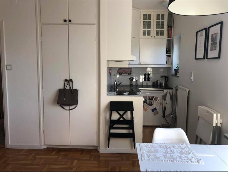 En fin etta högst upp med glimt över sjön. Lugnt område med närhet till vatten med badbrygga, naturområden och stor matbutik och Nära till tvärbanan som tar dig till Alvik och gröna linjen på några minuter, även gångavstånd på ca 15-20 min till Solna Strands tunnelbana.
