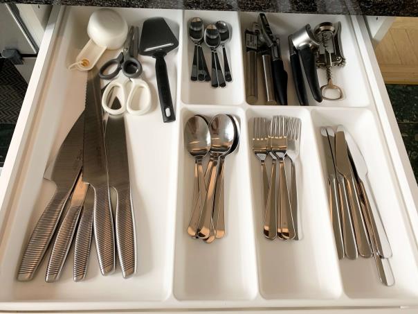 The kitchen and dining area is fully equipped with all appliances like a stove, microwave, fridge, freezer, oven, fan, dishwasher. All culinary utensils for cooking and dining are also included. This separate area also has a dining table and four chairs. From the kitchen, you have great water views!