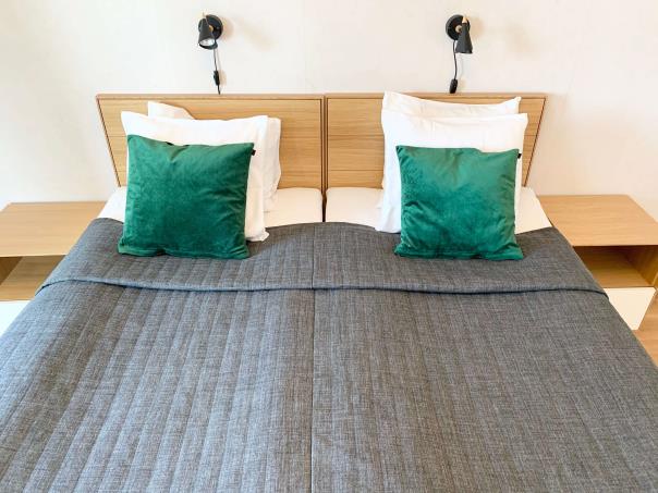 The bedroom is spacious and is accessible from both sides of the living room. There are a two single beds, clean sheets and linens as well as storage space, and a bed table.