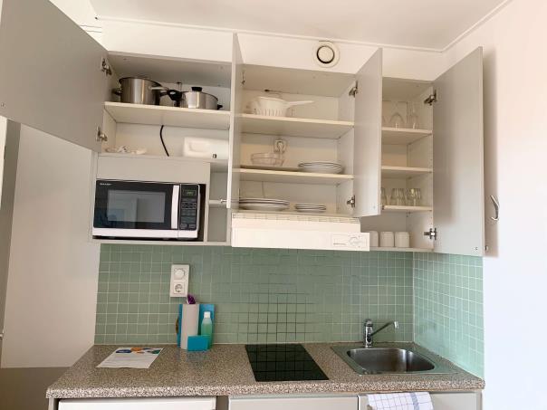This one-bedroom apartment is the perfect selection for individuals, a couple, or a small family. The bedroom holds a twin bed (90 cm*2) and the living room a sofa bed for two. Cook your food in the open-plan kitchen and enjoy the meals at the dining table that seats four people. The high-speed Wi-Fi connects to all your different devices and the TV in the living room shows numerous international channels.