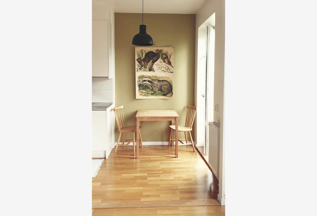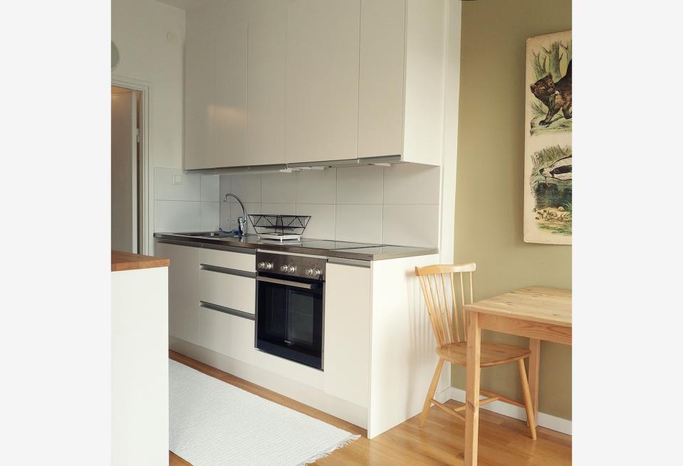 I köket finns ett matbord med två stolar, kaffe- och vattenkokare samt övrig köksutrustning som kan vara bra att ha (bestick, tallrikar, glas, kastruller, stekpanna etc). Här finns gott om förvaringsmöjligheter i skåp och lådor. Från köket kommer man ut på balkongen i bästa söderläge som vätter mot en lugn innergård. Mellan köket och sovrummet finns två inbyggda garderober.