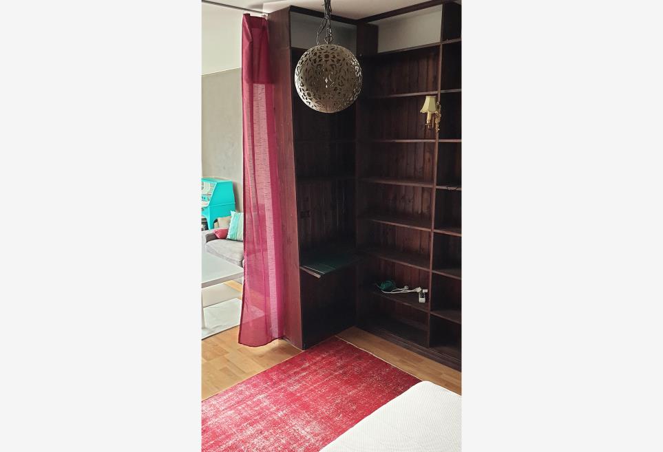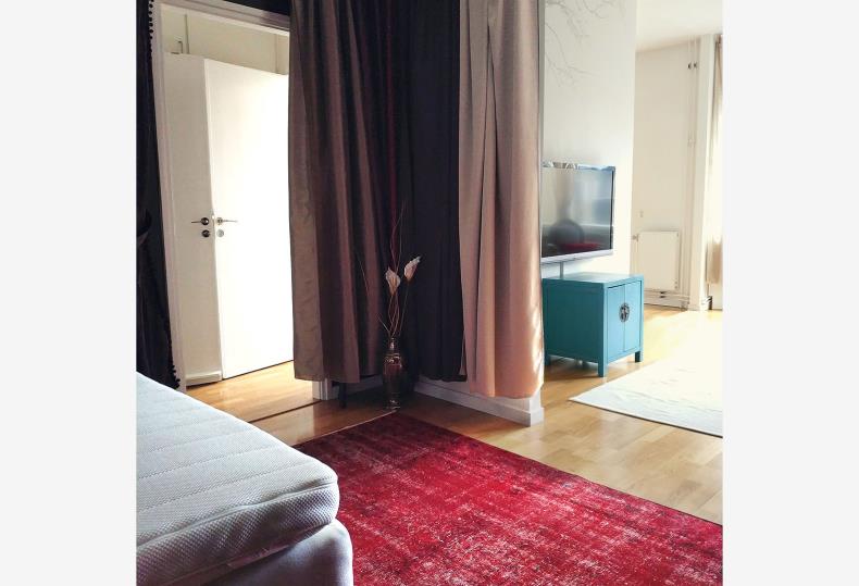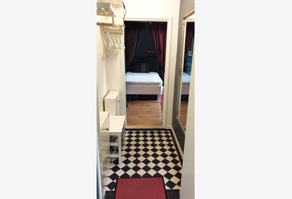 I hallen finns en helkroppsspegel och effektiv förvaring för skor och ytterkläder. Hallen leder in till det halvrum/inre hall som nyttjas som sovrum. I sovrummet finns säng (inkl täcke, kudde och överkast) och bokhylla upp till tak.