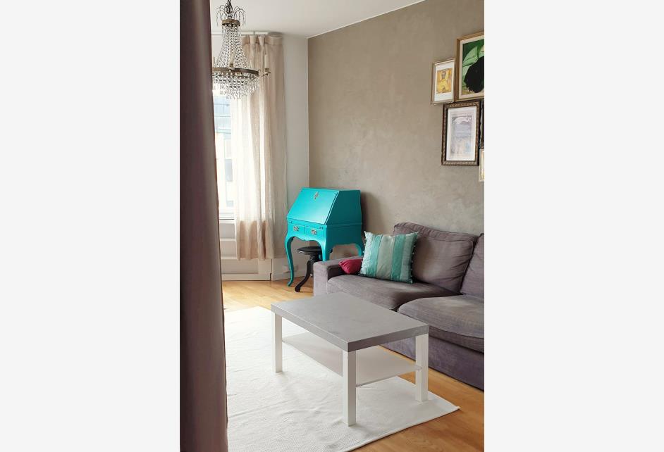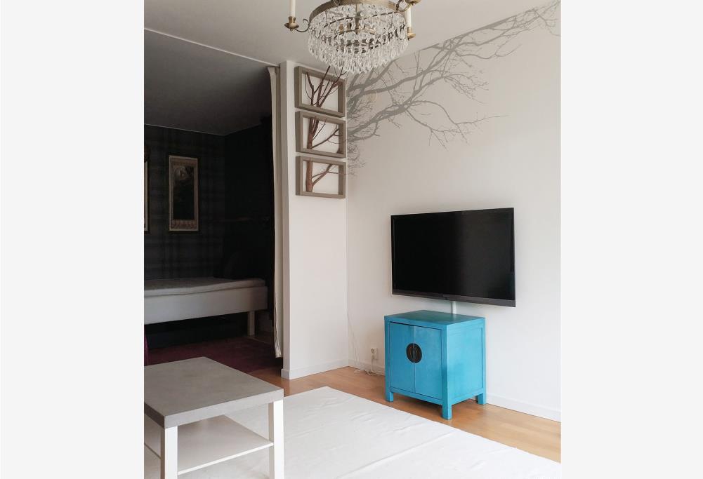 Vardagsrummet är ljust och luftigt, med soffa, soffbord, tv-möbel, tv, en sekretär och en liten kanapé.