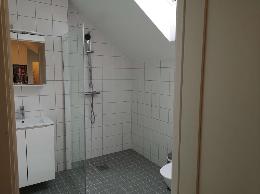 The bathroom is super fresh and modern and comes with a WC and a shower.