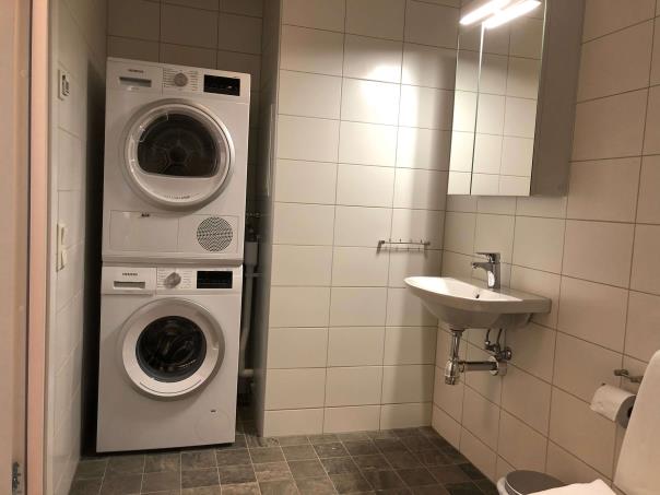 The bathroom is super fresh and offers WC, shower, washing machine, and dryer.