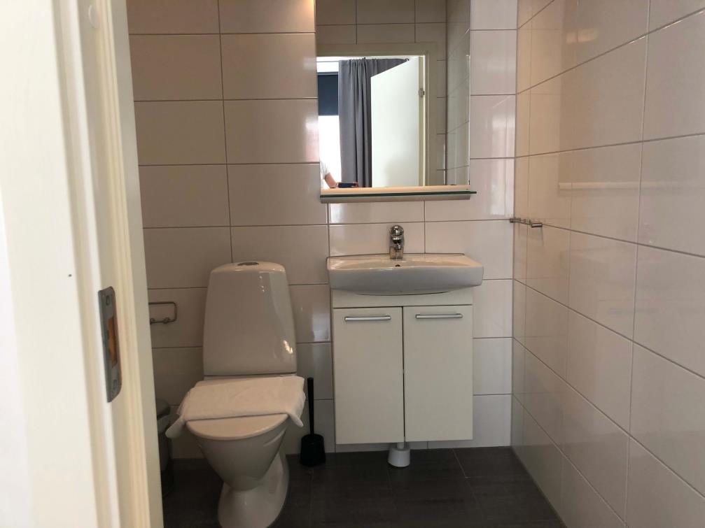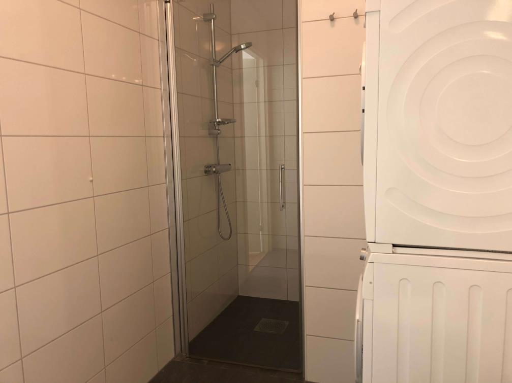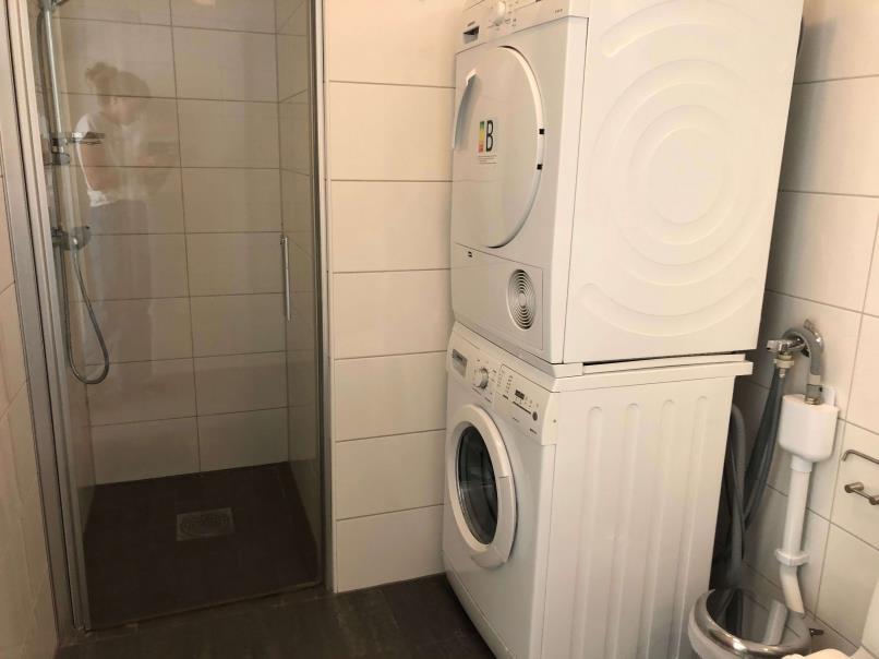 The bathroom is fresh and offers WC, shower, and washing machine. The bathroom is accessible from the bedroom.