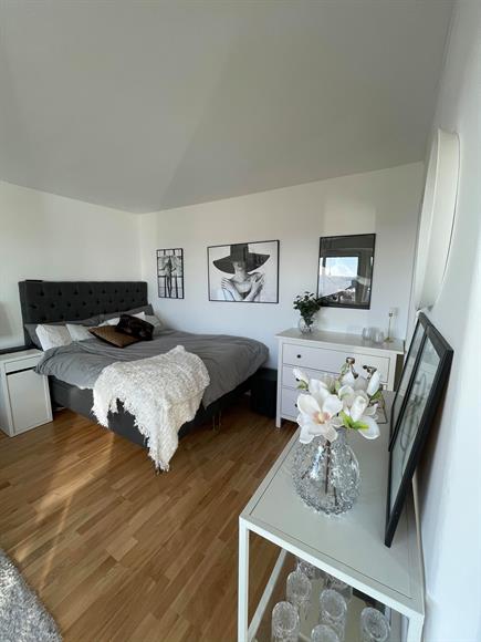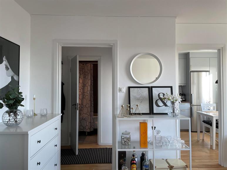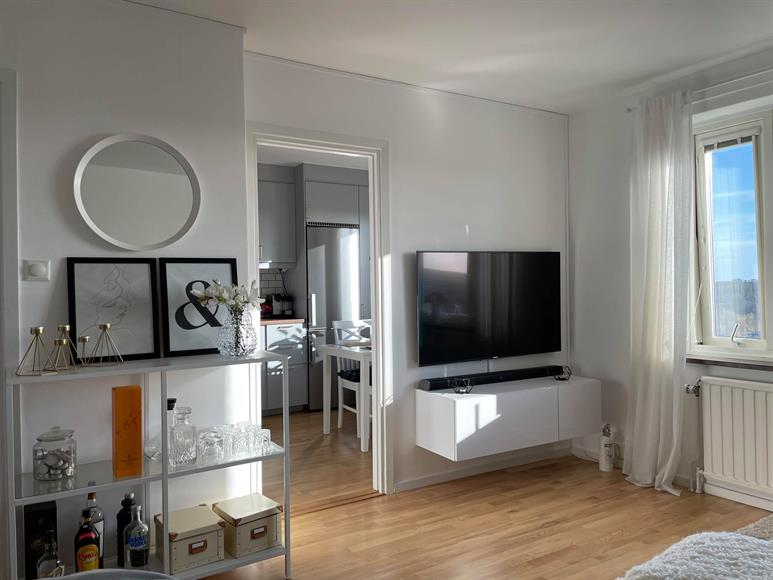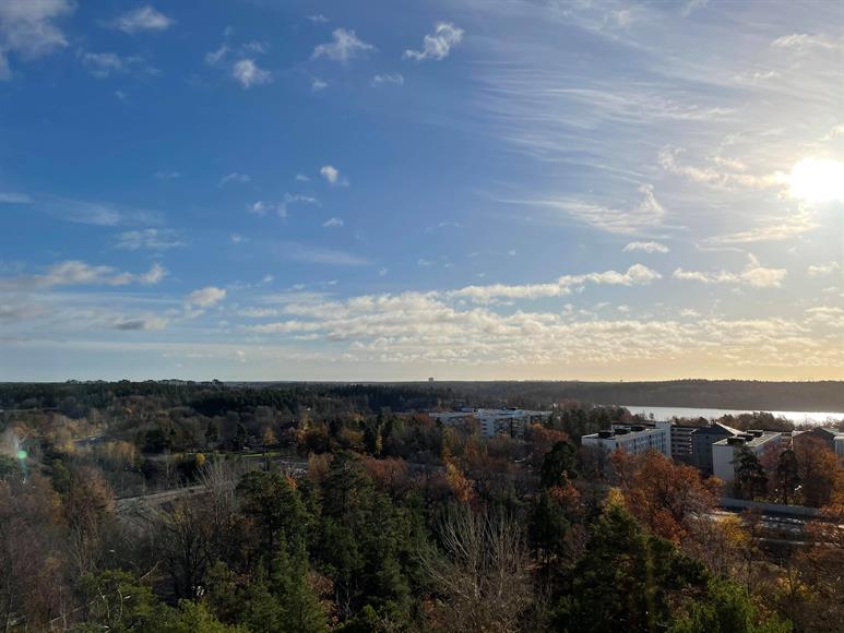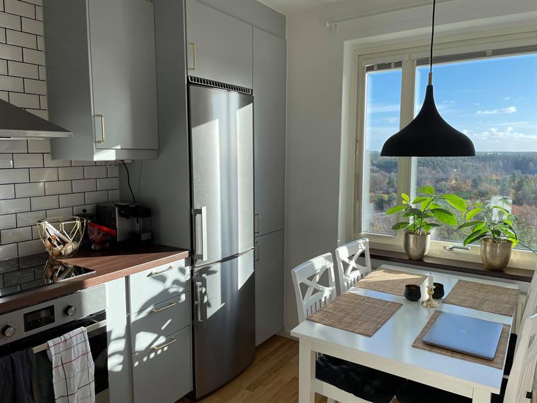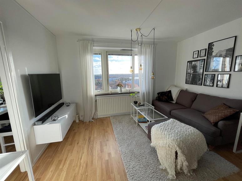 Ljus, fin och stor etta högt upp i huset med milsvid utsikt över både sjö och natur. Trevliga promenadstråk runt sjön Magelungen nås på några få minuter. Fri parkering utanför porten. 1 minut till pendeltågsstation samt 5 minuter till tunnelbana samt mindre centrum (Farsta Strand). 10 min gång tar dig till Farsta Centrum med alla dess butiker, caféer och gym. Gångavstånd till Ågesta Golfbana. Vill/kan man inte gå så finns busshållplats utanför dörren. Lägenheten kan hyras ut fullt, delvis eller inte alls möblerad.