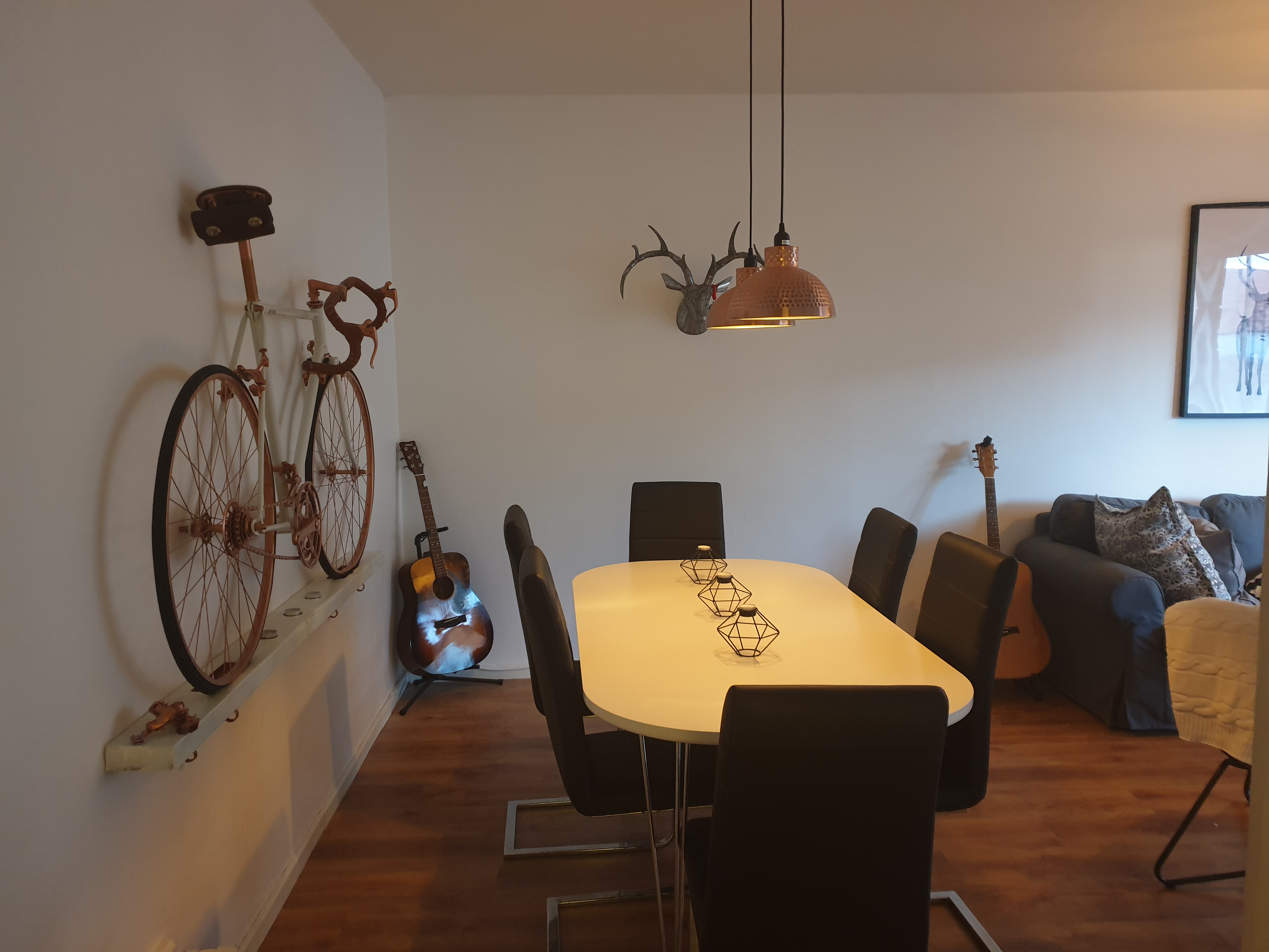VARDAGSRUM Laminatgolv, vita väggar, Utgång till inglasad balkong i söderläge
