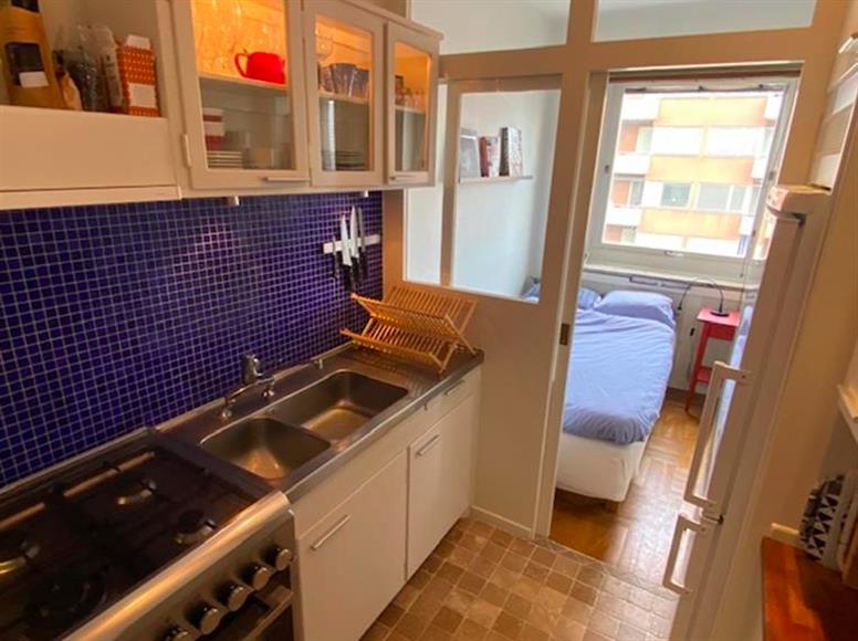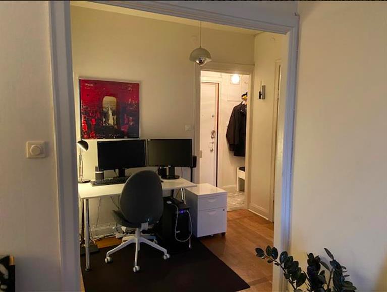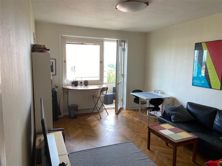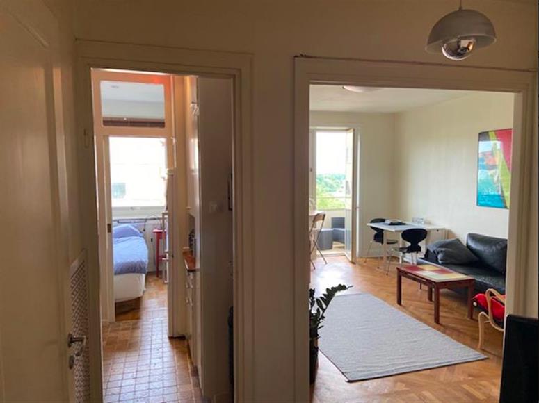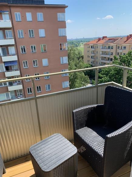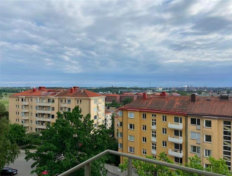 Lägenheten ligger på Rindögatan 25, 7 trappor och är på ca 37 kvm. Man kommer in i en liten hall där det finns en bänk, krokar och hatthylla.Här finns också en inbygd garderob. Sedan kommer man till en hall där det finns plats för ett bord med stol. Från denna hall finns en dörr till vänster som leder till kaklat badrum med dusch, handfat och toalett. Från denna hall finns en dörr till en garderob.Rakt fram kommer man till ett litet kök med ny gasspis och ny kyl med frys. Man går vidare genom köket och kommer till ett litet sovrum. Från hallen och från sovrummet kommer man in till vardagsrummetoch här finns en balkong dörr och på balkongen finns två stolar och ett litet bord.Lägenheten är möblerad med en bänk i den mindre hallen, bord och stol i den större hallen, säng, plus sängbord i sovrummet. I det större rummet finns, Tv bänk, med en Sony TV, soffa, soffbord, golvlampa, matbord med stolar, fönsterbord och en bokhylla. I köket finns köksutrustning, som porslin, bestick mm. Dammsugare finns.Tvättstuga med två tvättmaskiner, torktumlare och torkskåp finns i källaren.Lägenheten har en stöld och brandsäker ståldörr.