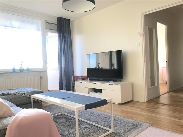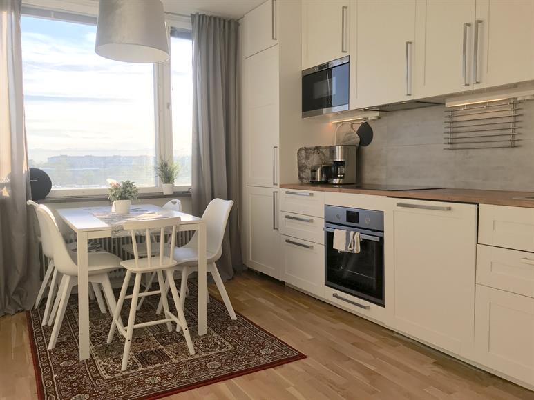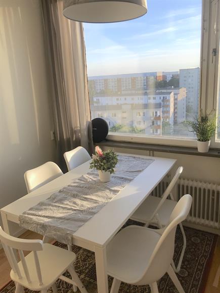 Trivsam 2a uthyres färdig möblerad till lugnt par/person.Söker till min bostad, lugn/lugna personer med stadig inkomst och en långtidshyresgäst.Fin och renoverad 2a med sina välplanerade 56 kvm, 10 trappor upp med milsvid utsikt. Rymlig hall med utrymme för avhängig.Stort vardagsrum med plats för vardagsrumsdel och arbetshörna. Stora fönsterpartier med trevlig utsikt och bra ljusinsläpp. TV finns att tillgå, enklare modell (äldre platt tv). Rejäl inglasad balkong 10 trappor upp utan insyn. Milsvid utsikt i västerläge som ger en trevlig eftermiddags-/kvällssol. Här kan man njuta av den milsvida utsikten. Rejält sovrum med inbyggda garderober. Stort fönster. Dubbelsäng och gavel. Nyrenoverat kök med inbyggda vitvaror (inkl Diskmaskin, Micro), trevlig matplats. Här finns allt från bestick, stekpannor, porslin, kaffekokare, brödrost, mixer etc. Badrum med WC och duschplats med glasvik dörrar. Området är väldigt lugnt, tar ca 5 min att promenera till Västra Skogens tunnelbana (blåa linjen). Dörr till dörr tog 20 minuter när jag jobbade på Vasagatan. Tar ca 20 minuter att promenera till Hornsbergstrand och ca 10 minuter till Solna Centrum. Finns en ICA 3 minuter ifrån. Nästan alla möbler på bild, el, 100mbit bredband ingår i avgiften. Tidigast tillträde mitten på Augusti, senast slutet på Augusti. Skicka PM, är inte snabb på att svara men gör mitt bästa.