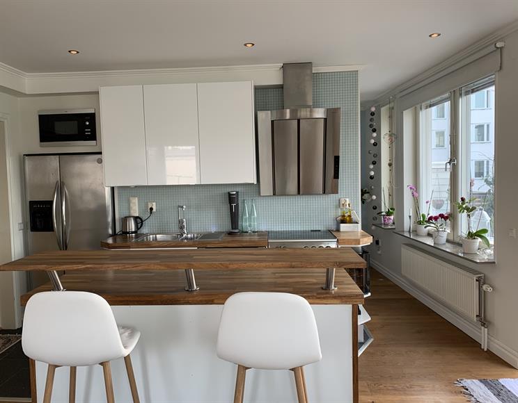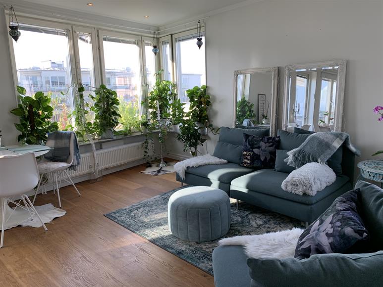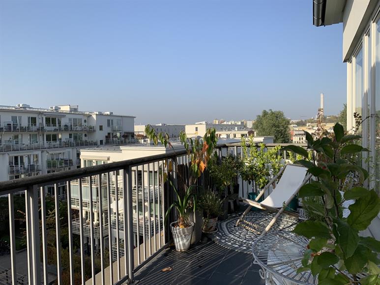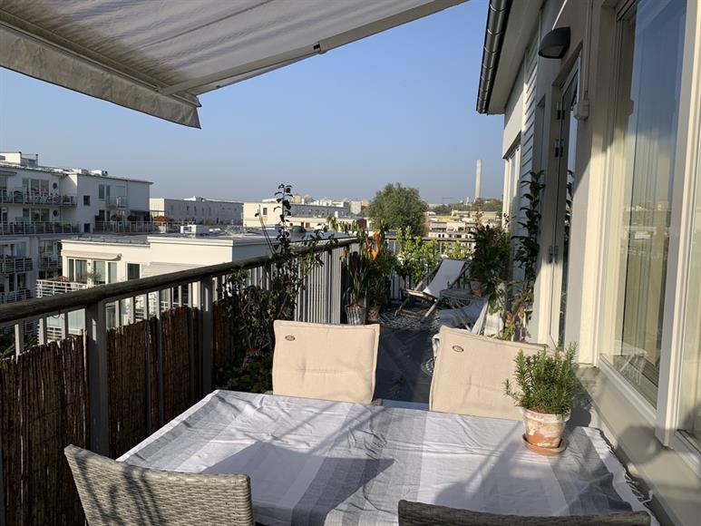 Härligt ljus två längst upp med stor takterass längs med hela lägenheten. Lugnt område i Hammarby Sjöstad med restauranger och livsmedelsbutiker runt hörnet. 300 meter till tvärbana och bussar. Här finns fina grönområden, Hammarbybacken och massa olika gym och andra träningsformer. Det är en speciell känsla och bra karma i Hammarby Sjöstad. 12 minuter med kollektivtrafik till City, 20 minuter på cykel. Till söder tar det 10 minuter att gå, eller varför inte ta båten.
