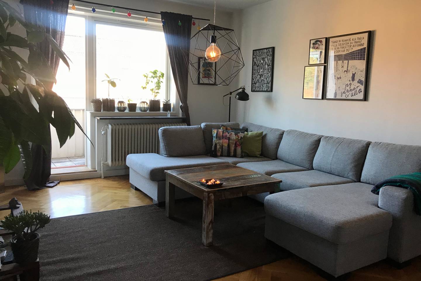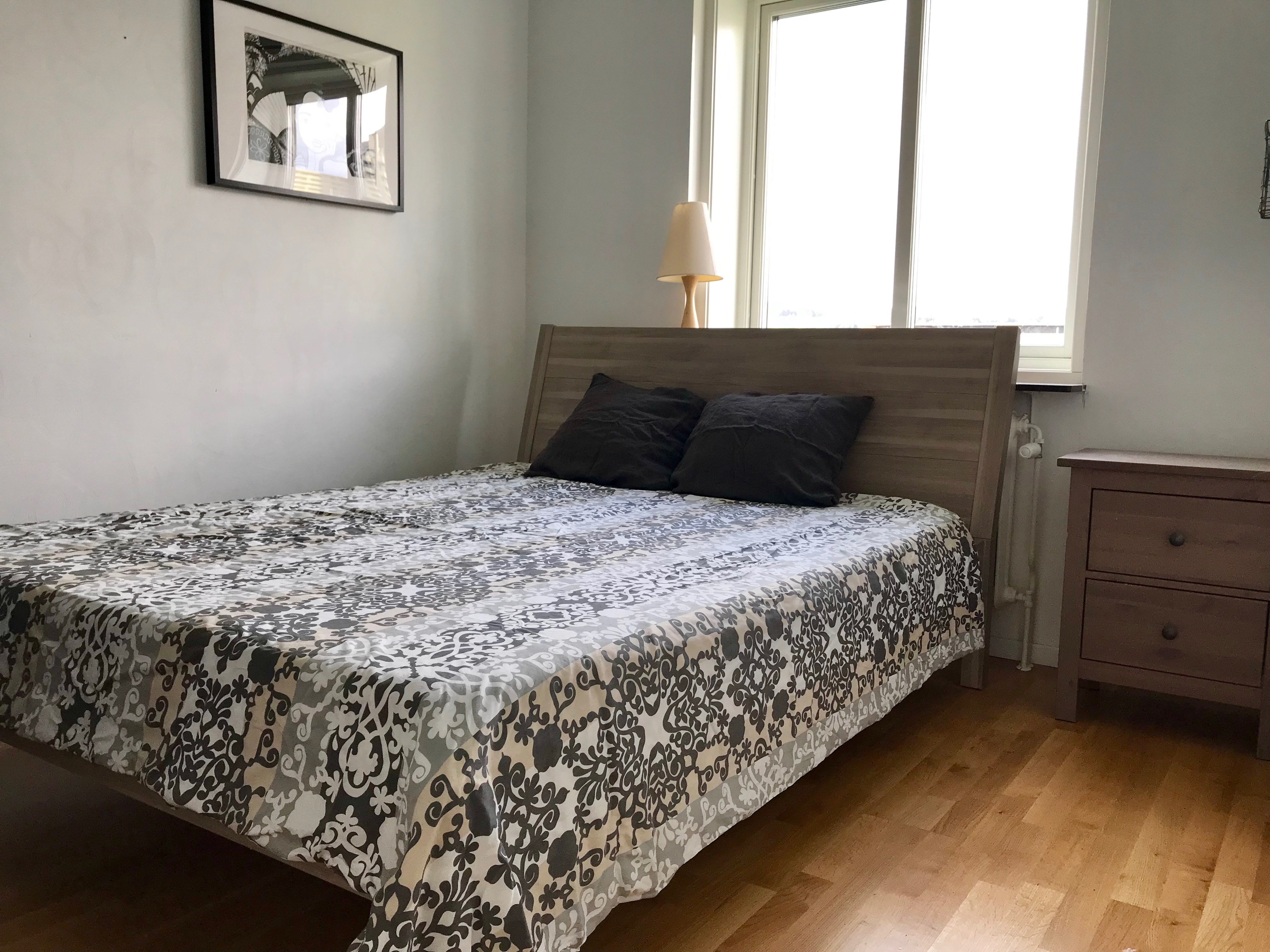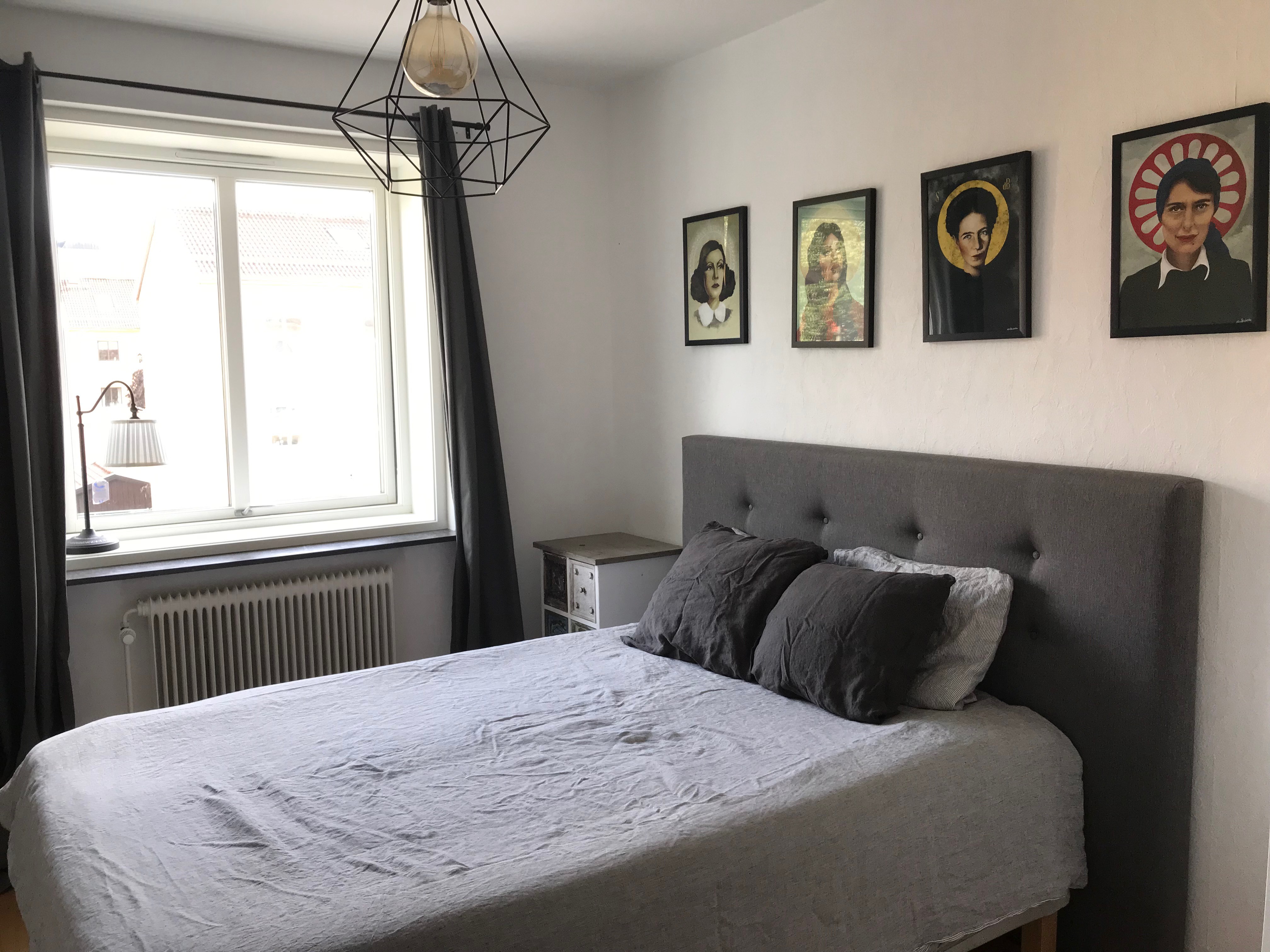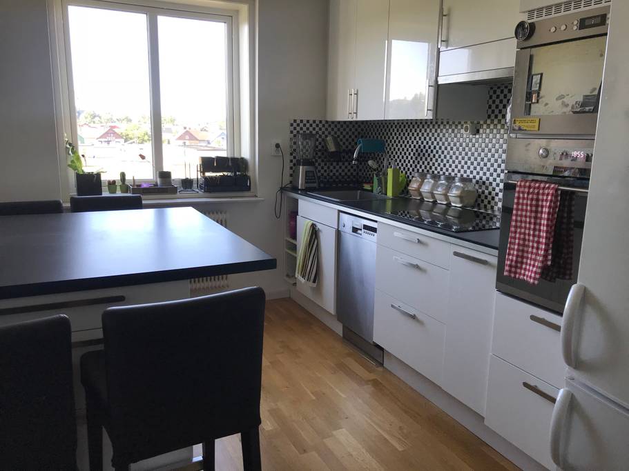 The rooms have a double beds and a lot of wardrobe space. The kitchen is fully equipped with a dishing machine. There’s also a balcony with a small sofa, perfect for warm summer nights. The apartment is on the top floor so the sun is always shining on it.