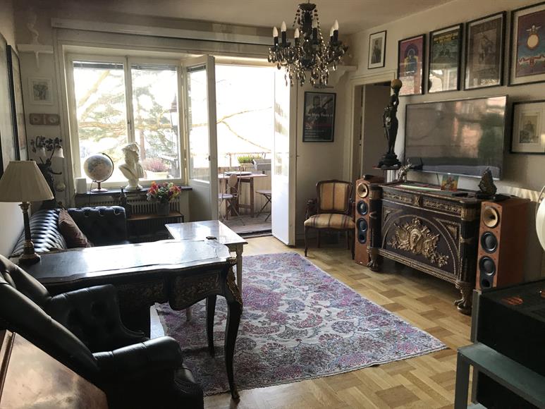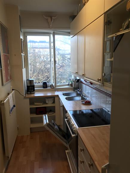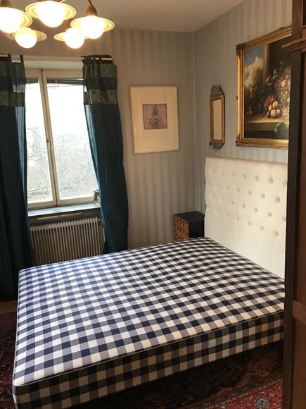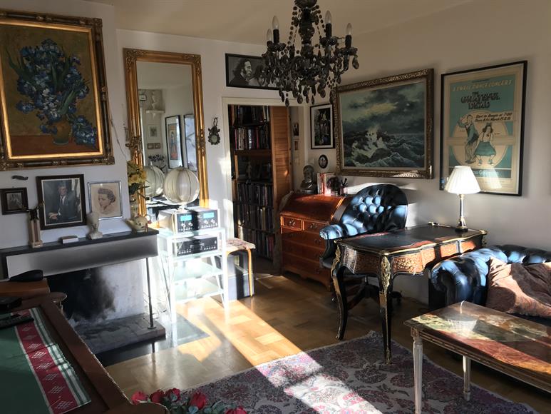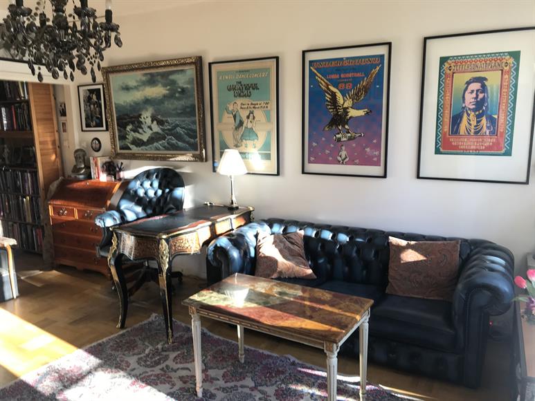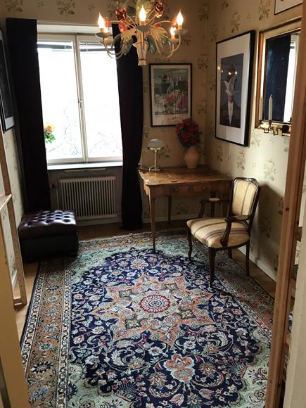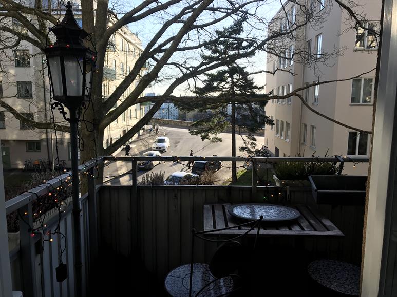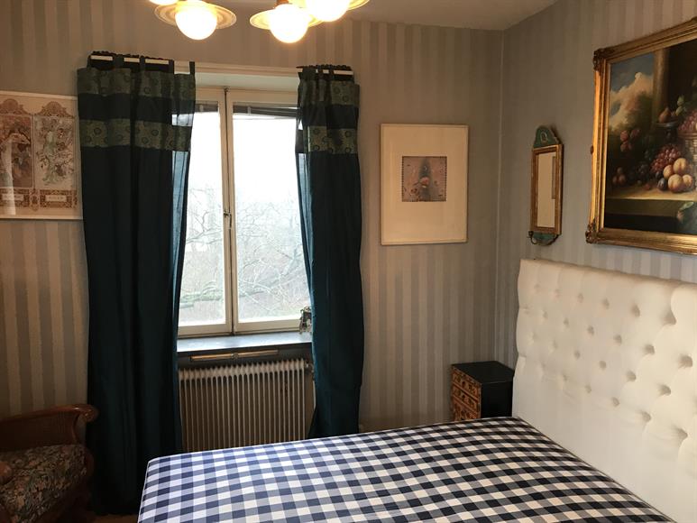 Ljust och högt läge på bergsknalle i Fredhäll i en av Stockholms få kvarvarande "trädgårdsstäder" med lång mellan husen och härligt fri utsikt med mycket träd och himmel och viss Mälarutsikt från vardagsrummet där det finns såväl balkong som väl fungerade öppen spis. Lugnt med trevliga omgivningar. Gångavstånd till Fredhällsbadet och Smedsuddsbadet. Tre rum plus avlångt kök utan plats för normalstort matbord. Hästens dubbelsäng i sovrummet, stor fräsch, relativt nyinförskaffad Chesterfieldsoffa i vardagsrummet som i ett handgrepp förvandlas till en rymlig, bekvämt säng med plats för två. Även det tredje rummet har utrymme för en dubbelsäng vid behov. Två hallar med bokhyllor. Modern 55-tums Samsung-tv. Automatiskt nedfällbar filmduk i vardagsrummet som även fungerar som vältäckande rullgardin om man vill. Trevligt möblerad, flertal rymliga skåp och garderober. Steroanläggning av klass, köksutrusning med mikro med mera.