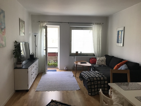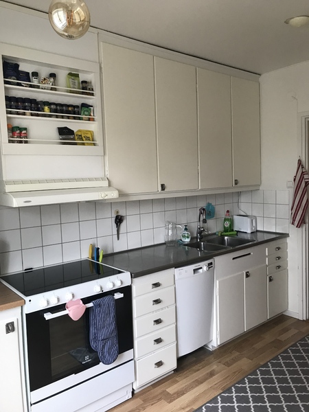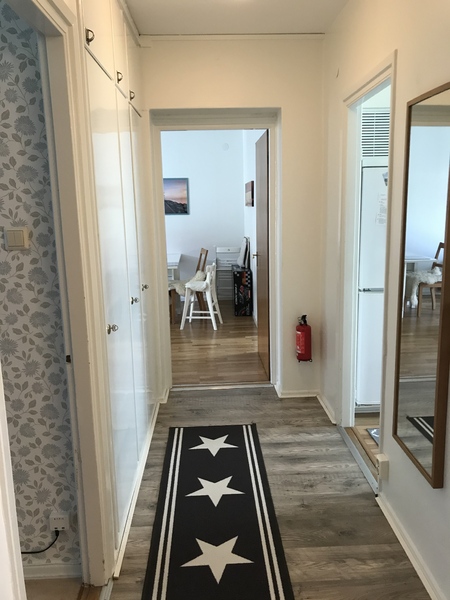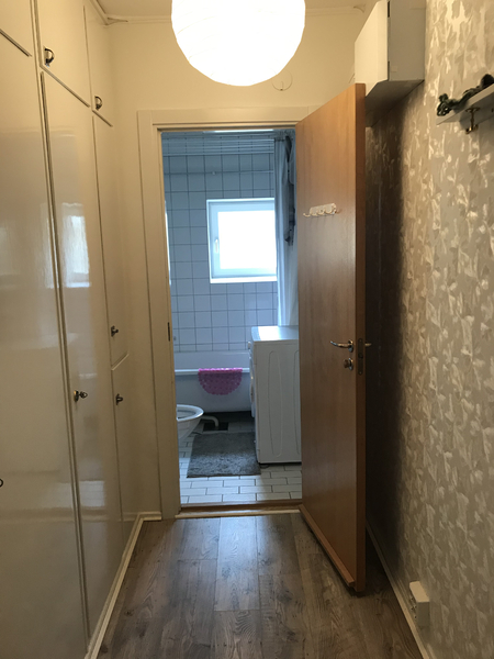 Bra planlösning. Mycket förvaring. Ljusa tapeter i alla rum.
