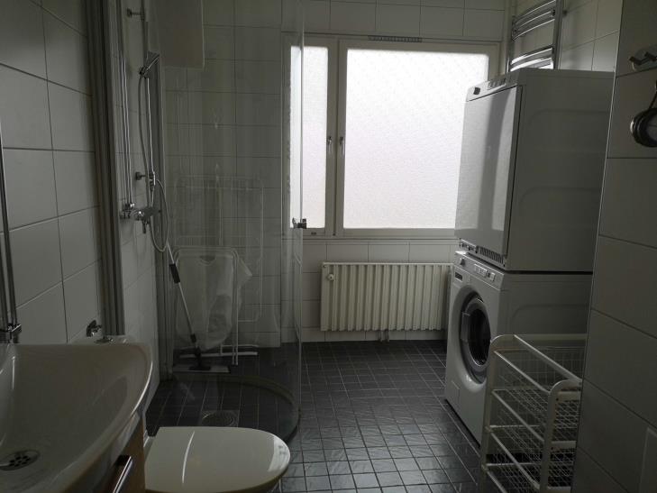 The bathroom has a WC, a shower, a washing machine, and a dryer.