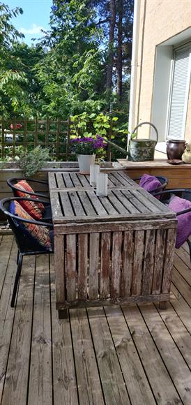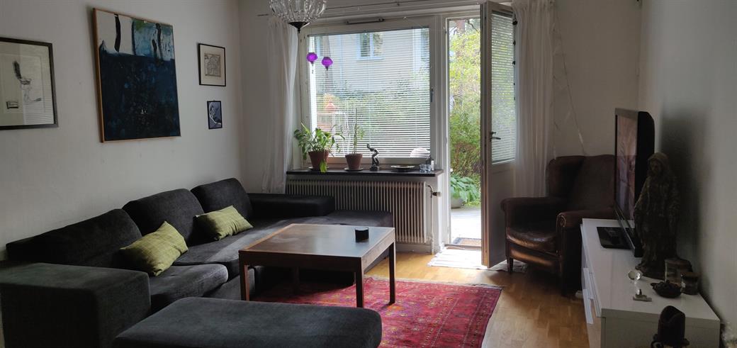 Ljus och fin lägenhet i lugnt och barnvänligt område med gröna omgivninger. Hela lägenheten renoverades och målades om 2015.2 sovrum och stort vardagsrum med utgång till den privata uteplatsen med sitplats för 6-8 personer.Promenadavstånd till mysiga Årsta centrum, Gullmarsplan och Globen. Årstaskogen ligger ett stenkast bort. Bra parkeringsmöjligheter på gatan och 1 min till busshållplatsen.Lägenheten är fullt möblerad. Allt som behövs finns i köket inklusive porslin mm. I vardagsrummet finns en 55" TV. Bredband ingår i priset och bra med förvaringsmöjligheter i lägenheten.