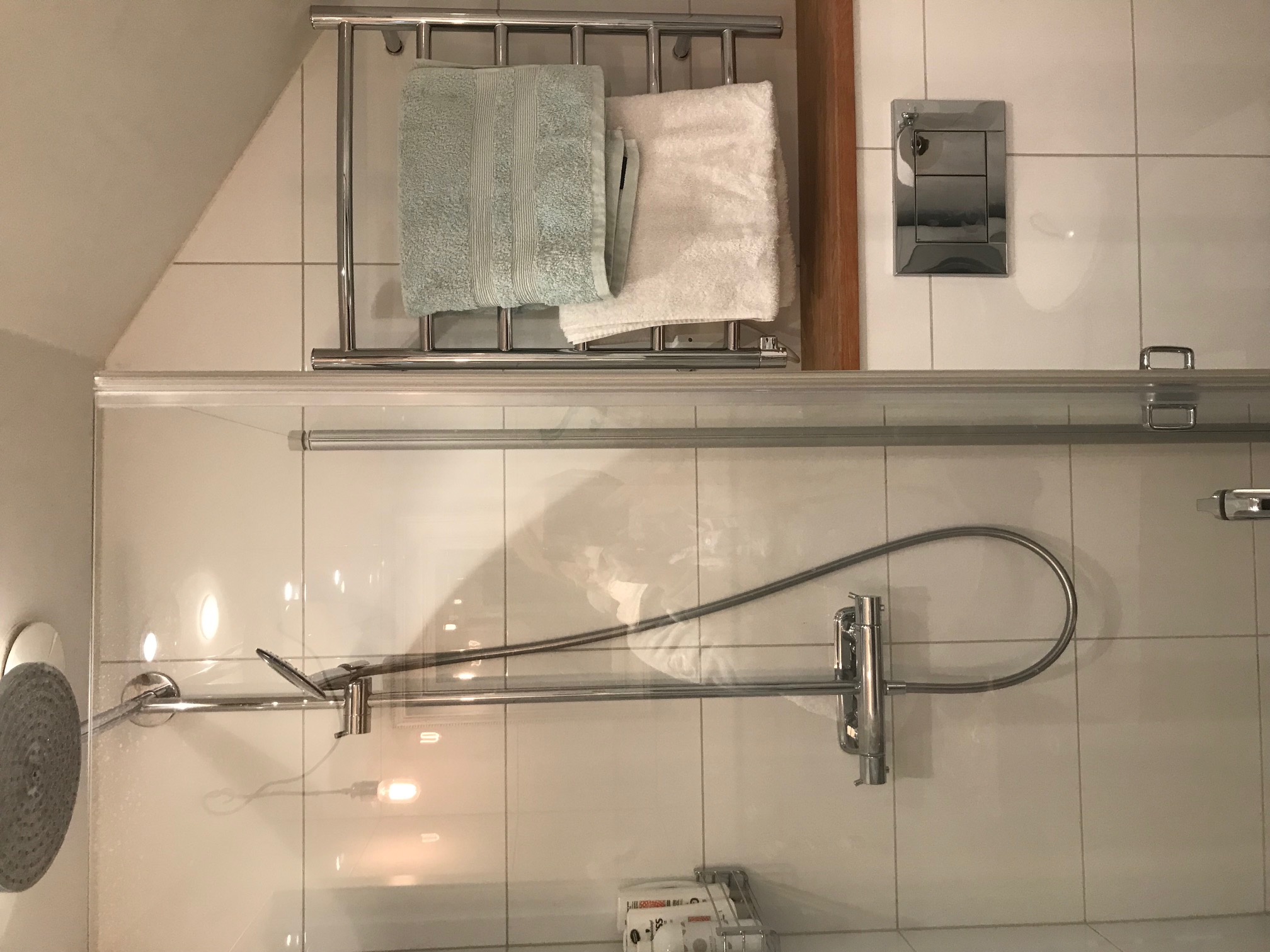 Öppen planlösning mellan kök och vardagsrum på första våningen, badrum – wc/dusch plus kombi tvätt/torkmaskin.