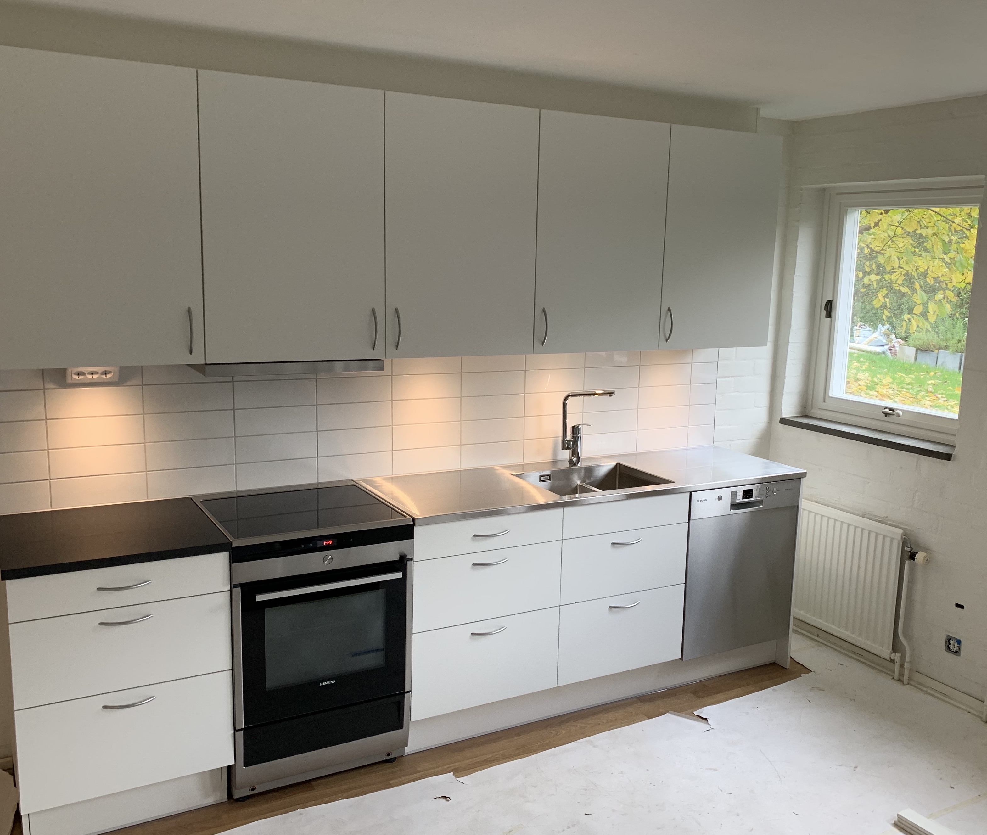I det nybyggda, helkaklade badrummet finns tvättmaskin och torktumlare. Det nyinstallerade köket har bänkskivor av sten och är utrustat med diskmaskin, en stor kyl/frys, samt induktionsspis. På fotona från köket finns det fortfarande spår av det nästan avslutade renoveringsarbetet i form av täckpapp.