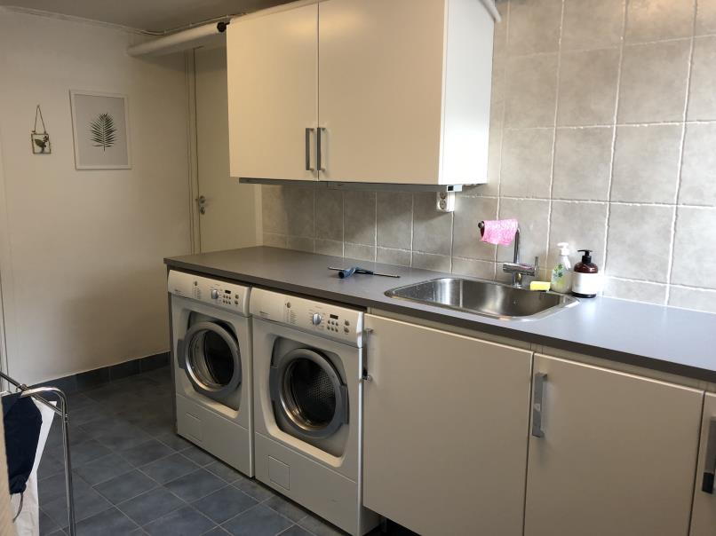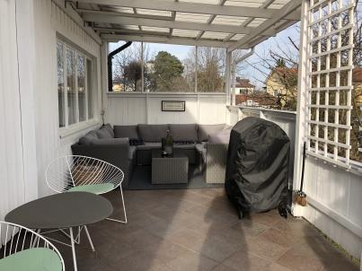 The property offers terraces on both sides. The garden is cosy, while easy to maintain. The Carport fits one car. Upper floor has three bedrooms, a small living room, and a large bathroom with bath and steam shower. WC, kitchen, dining room, living room with fireplace, and library / media room equipped with SONOS sound system and a Samsung 8-series TV on entrance floor. Terrace with BBQ and lounge furniture is accessed from the dining room. Laundry room with two washing machines, dryer and drying cabinet is located in the basement. So is a food/wine cellar, sauna, jacuzzi, shower, and guest bedroom with double bed.