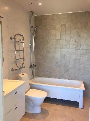 in light colors with oak wood floors. Both bathrooms have underfloor heating.