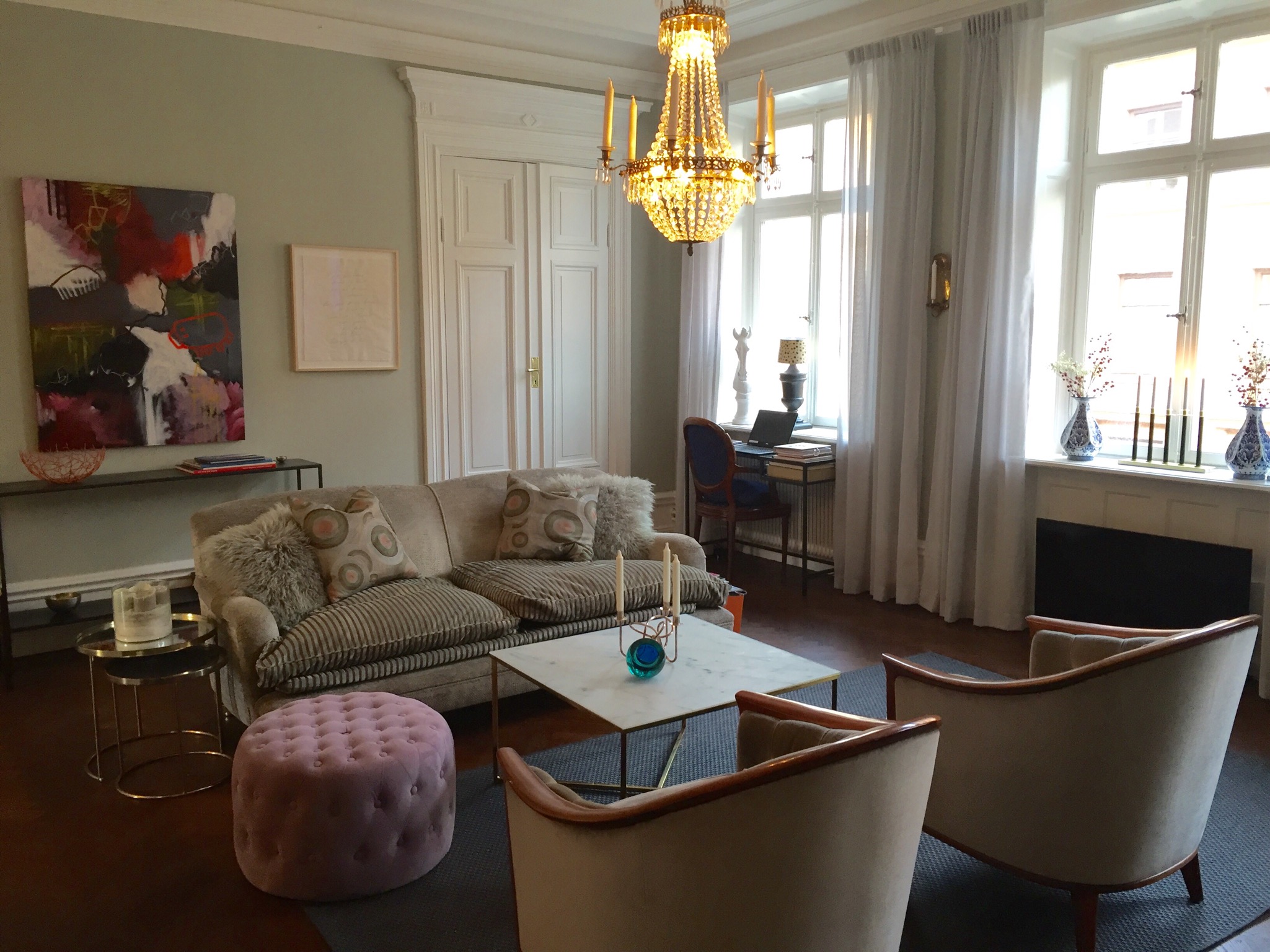 Tastefully furnished large flat in sought after location in Stockholm. Perfectly located close to city centre, parks, nature and beach. Fully furnished , 3 bedrooms, large balcony and spaceous and light kitchen perfect for entertaining. 2 bedrooms with library that can be converted to 3rd bedroom. Newly renovated bathroom with washer dryer. Minimum 1 month