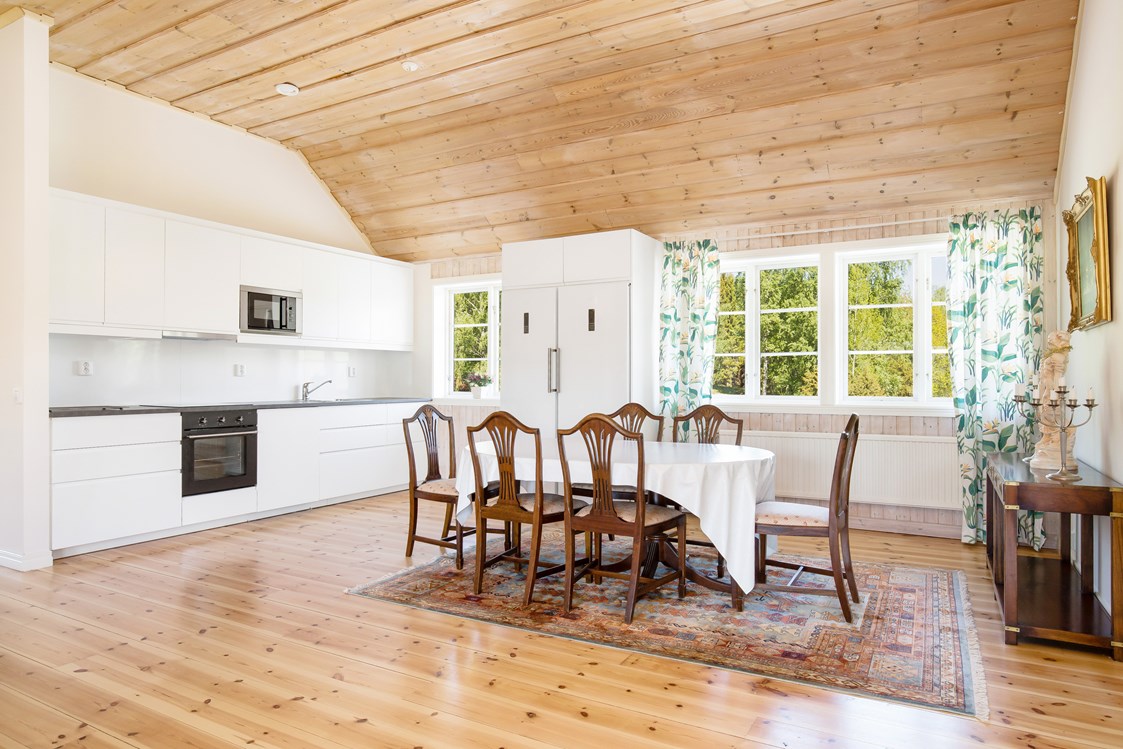 Magnifikt öppen spis, högt till tak 340 cm. Vackra breda furugolv, 3 rymliga sovrum. Stor hall vid entren med förråd.