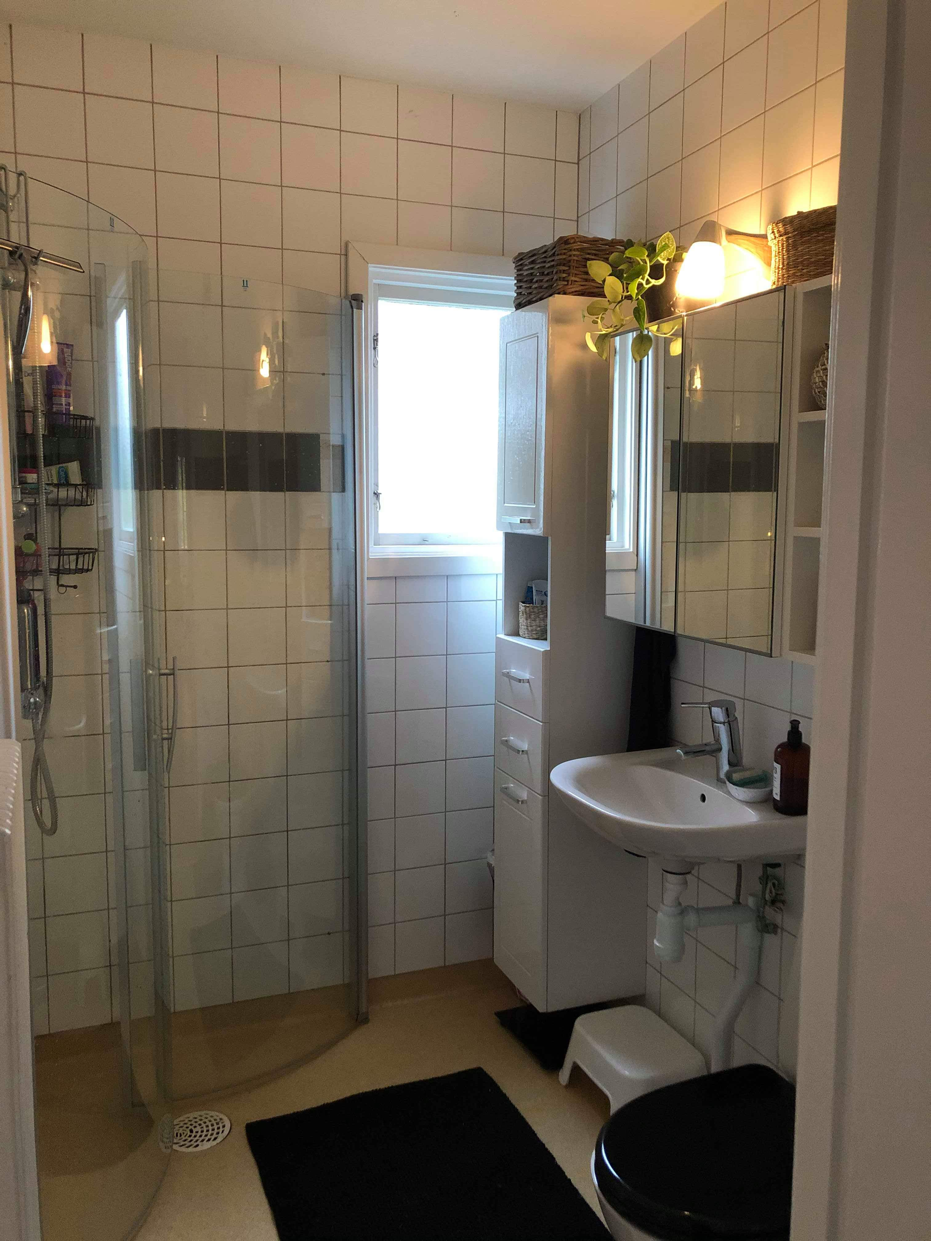 helkaklat badrum med nya duschglasdörrar