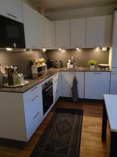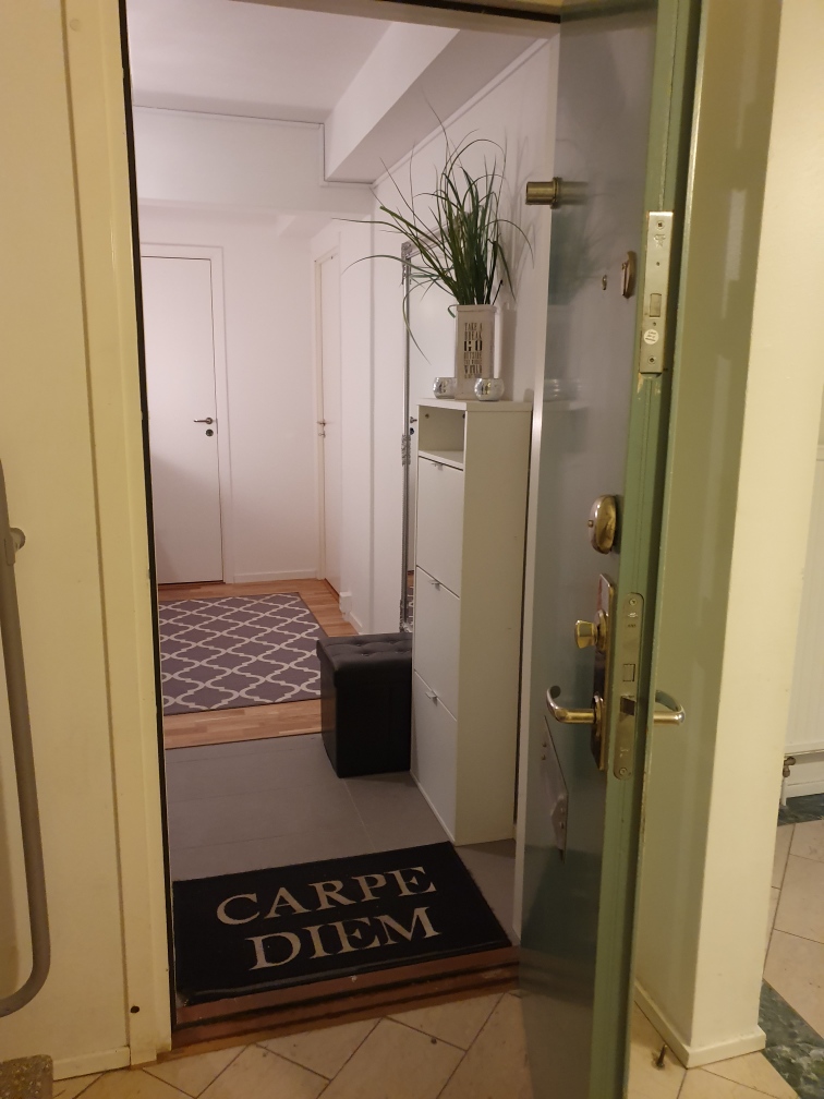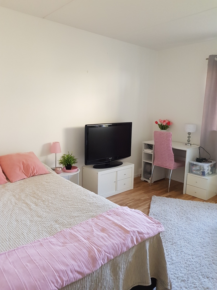 Rummet är relativt nära ytterdörren och det ligger även avskiljt från min svärmors rum. De utrymmen som ni kommer att dela är köket, toaletten och hallen. Lägenheten ligger på bottenvåningen i ett relativt nybyggt hus. Det är fullt möblerat och det finns även en tv, dock behöver du använda din dator etc för att kunna använda tv:n. Wi-fi finns!