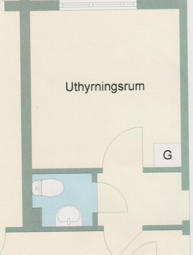Har WC och dusch, egen ingång och en liten hall att hänga av ytterkläder. Rummet är 12,7 kvm och är enkelt möblerat.