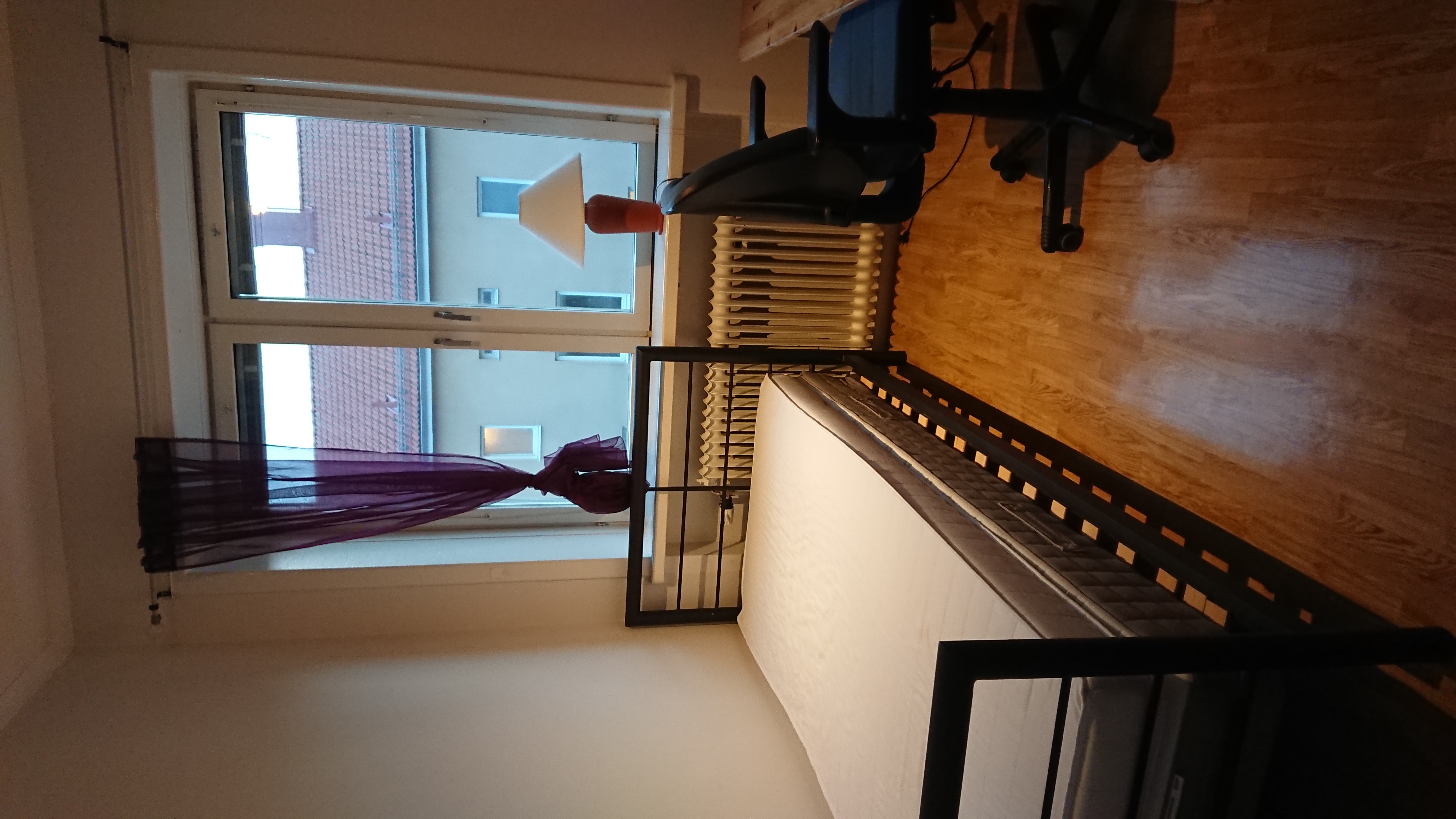 90-säng, skrivbord, garderob, bokhylla. Tillgång till övriga utrymmen.