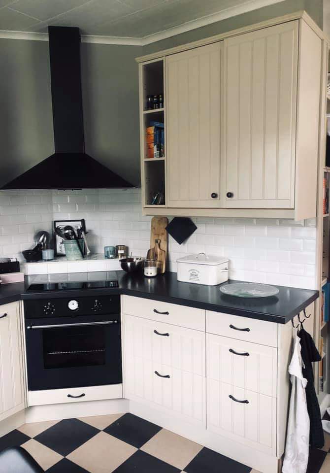 Kök: induktionshäll, inbyggd varmluftsugn, inbyggd/dold diskmaskin, inbyggd micro, kyl/frys, skafferi med ventilation. Schackrutigt linoliumgolv.