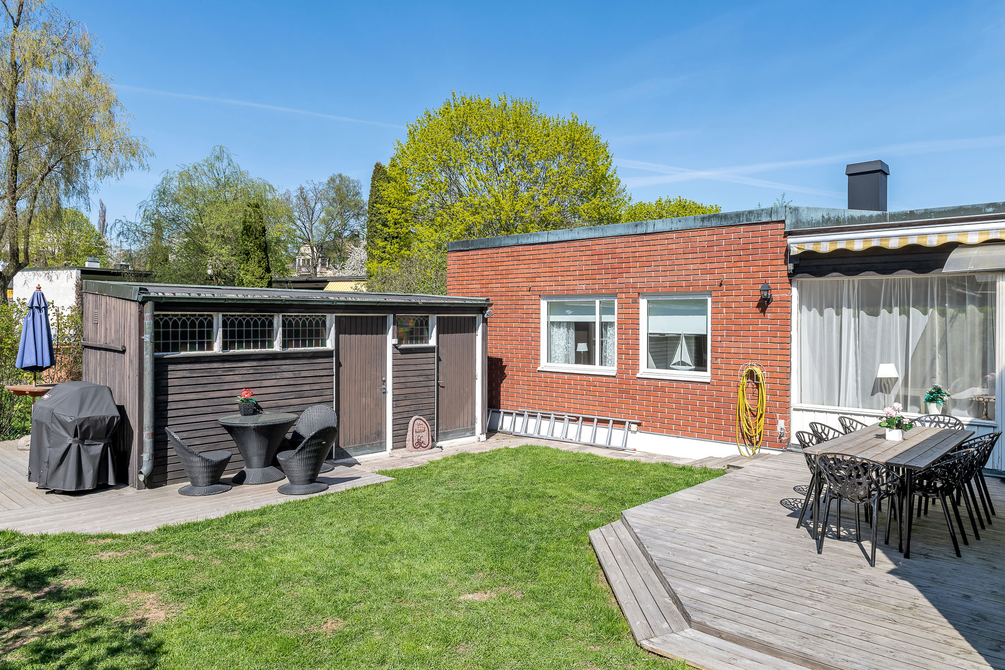 Welcome to this one level 5 room townhouse with 3 bedrooms of approx. 152 sqm in size. Located in the serene area of Stocksund with a small garden and patio (260 sqm). Guest parking as well as a garage space is included depending on the furniture level (with less furniture, the landlord may need to store surplus items in the garage); currently the townhouse is available with furniture but this could be altered somewhat. Modern bathrooms, fully equipped kitchen with some extras such as wine cooler.