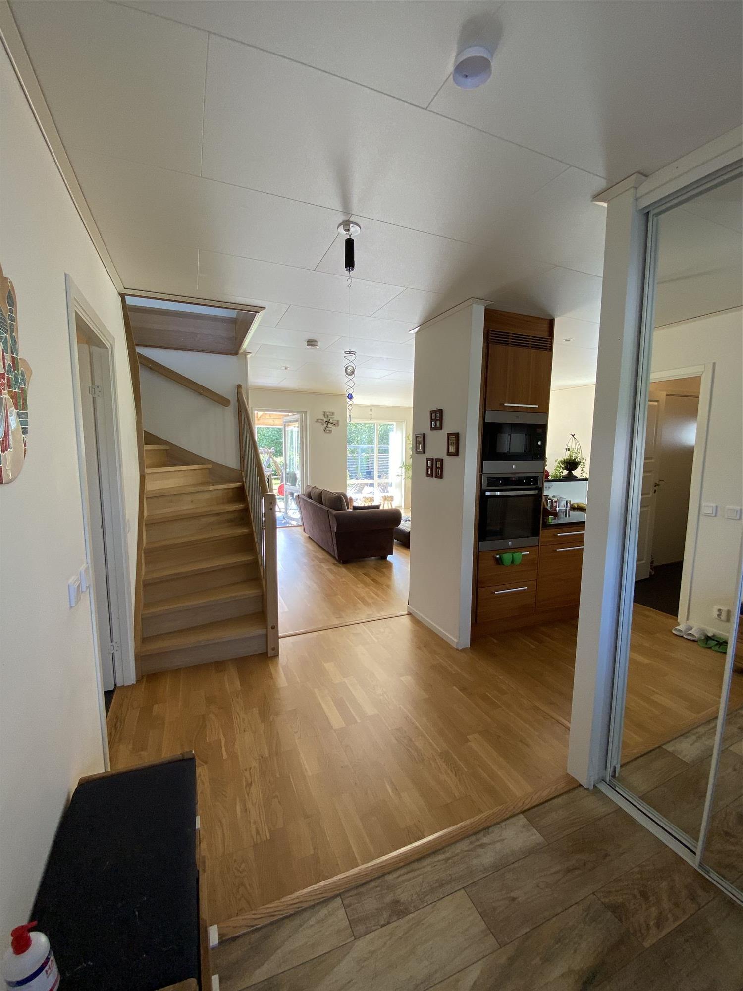 Genom halvöppen planlösning når man vardagsrummet med självklar plats för soffmöblemang. Den utbredda altanen i söderläge agerar harmonisk förlängning av de sociala ytorna. Vidare möts man på entréplanet av genomgående vattenburen golvvärme samt ett av bostadens, välutrustat badrum och tvättstuga med separat värmecentral. Via en vacker trappa presenteras det övre planet med ljusa ytskikt där resterande sovrum är belägna tillsammans med en walk-in closet och ett praktiskt disponerat badrum.