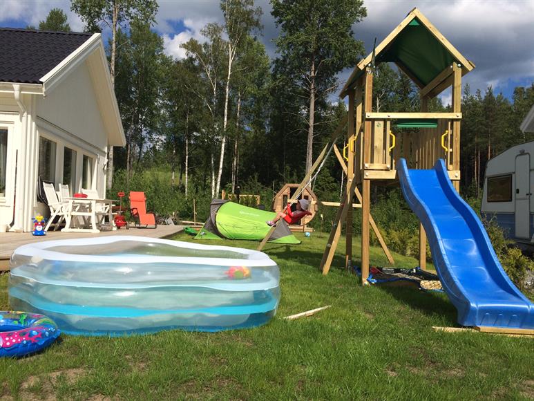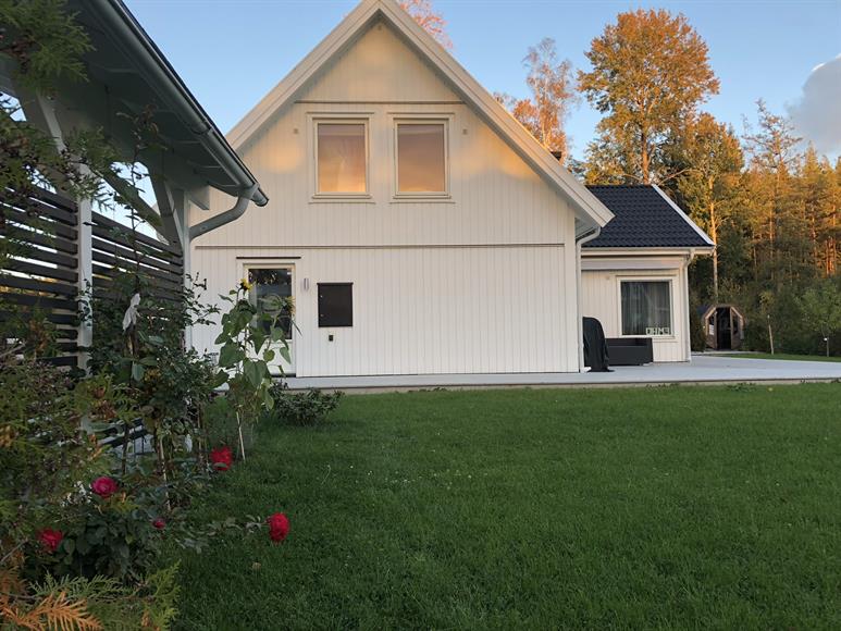 En modern villa, byggd 2014-2015. Med tillhörande vedbastu, kamin, stor altan och en barnvänlig tomt med skogen som närmaste granne. Stor parkering med tillhörande carport. Internet via fiber. Nära till buss, förskola och en bra skola. Det finns 2 badrum och 5 sovrum i huset. Lugnt område, nära till Lejondalsslott och en stor badplats.Finns möjlighet att hyra utan samt delvis möblerat.