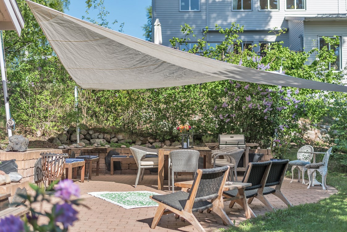 Tomten är härlig, lätt kuperad och med mycket grönska – och troligen Skarpängs vackraste kastanjeträd! Det finns flera uteplatser; en stor stenlagd ”piazza” med segeltak för de större sammankomsterna samt en uteplats under tak mot sydväst. Här kan du njuta av solen från morgon till kväll!