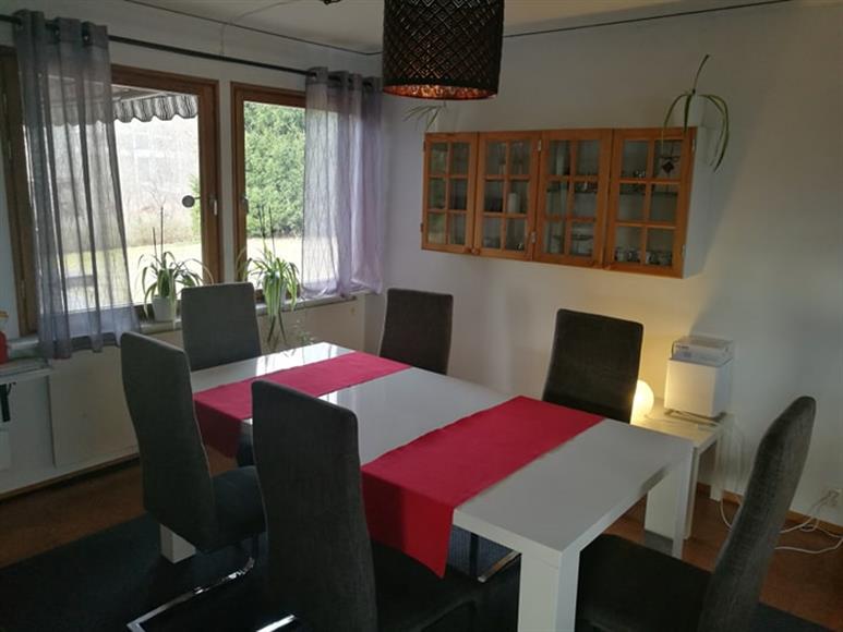 Mycket välvårdad villa på cca 300 kvm belägen på en lugn återvändsgata i väldigt populärt villa området med fina cykelvägar till skola och centrum, gångavstånd till tågstation, mataffärer samt vårdcentral. Lättskött och insynsskyddad trädgård med sol större delen av dagen fram till sena kvällen. Stor altan med soldäck på baksidan.I entre våningsplanet finns stort vardagsrum , 4 sovrum, kök, matplats, 2 badrum (golvvärme) med dusch, tvättstuga( tvättmaskin och torktumlare) samt groventré och slutligen en stor och fin altan mot trädgården.Källarplanet har idag gillestuga med öppen spis , pentrydel – mindre kök med spisplattor och kylskåp, diskbänk, 2 sovrum, toalett , dusch finns separat vid bastu, hobbyrum eller spelrum, 3 förråd. Huset har en normalstandard och utformning av sovrum kan anpassas efter hyresgäst. Plats för max 3 bilar på uppfart, garage ingår ej. Uthyres tidigast från 15:e april och upp till 1 år med möjlighet till förlängning. Om önskemål finns kan huset vara till salu.Viktigt att ni som bor här är intresserade av att ta hand om tomten och se till att det fint och rent runtomkring. Mycket trevliga grannar.Rökning förbjuden. Husdjur diskuteras. Huset uthyres 70% möblerat. Exakt vad som ska ingå i uthyrningen görs upp med hyresgästen.Huset värms upp med en luftvärmepump för att hålla nere kostnaden.Hyresperiod: minst 6 månader. Kreditupplysning kommer att tas innan kontraktskrivning.I hyran ingår internet, hemförsäkring , Sector larm , sophämtning . Förutom bashyran tillkommer kostnad för el, vatten .